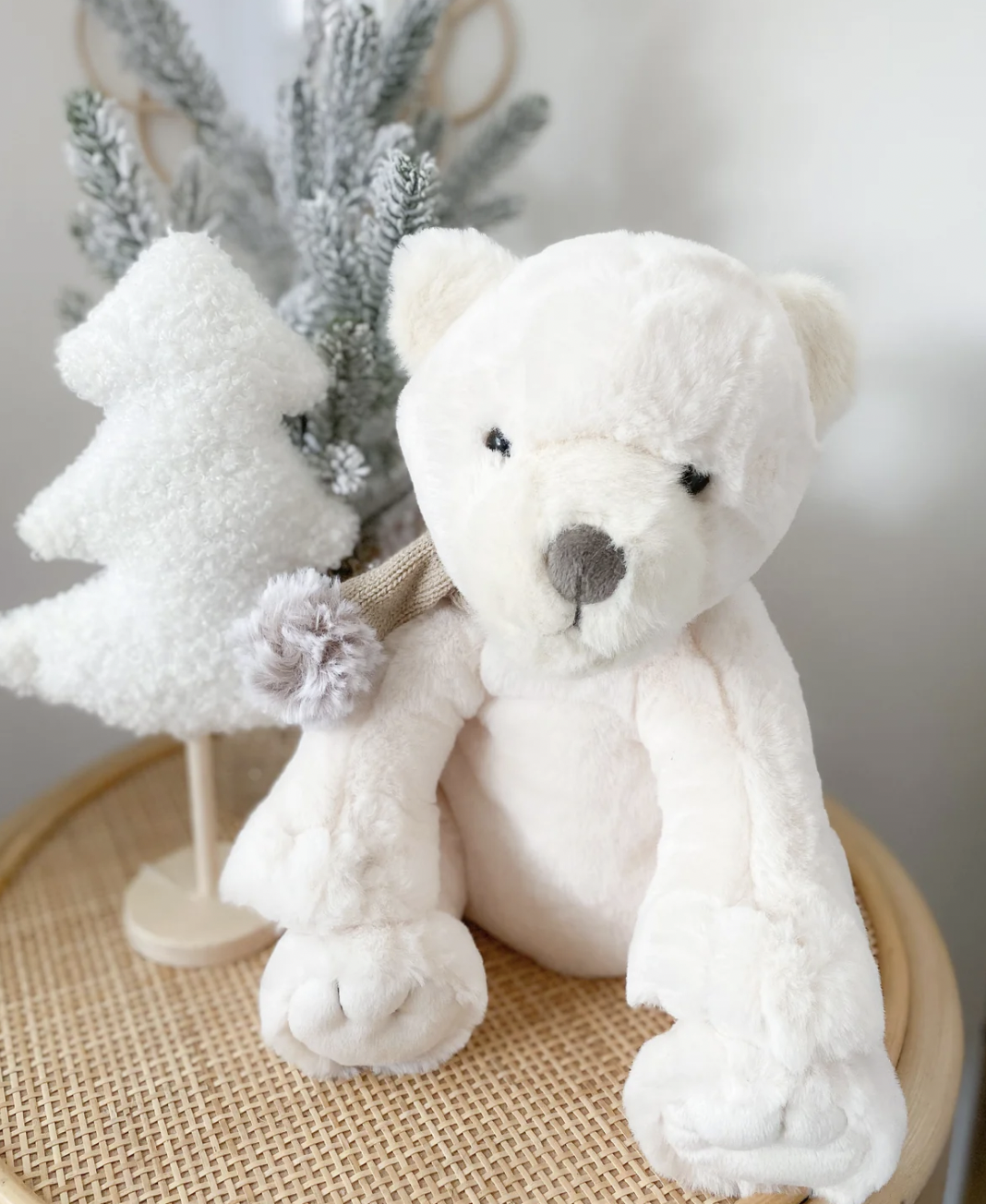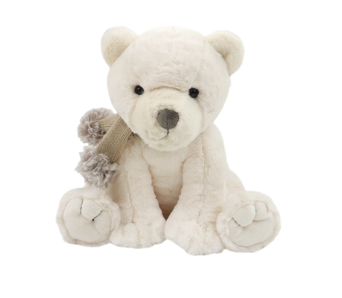 Meet Scout. This adorable little polar bear plush toy is ready for cooler temperatures in his novel knit pom, pom scarf. Super soft and ready to cuddle, this one-of-a-kind bear plush toy is ideal for the stuffed animal lover who needs something extra-special in their collection.