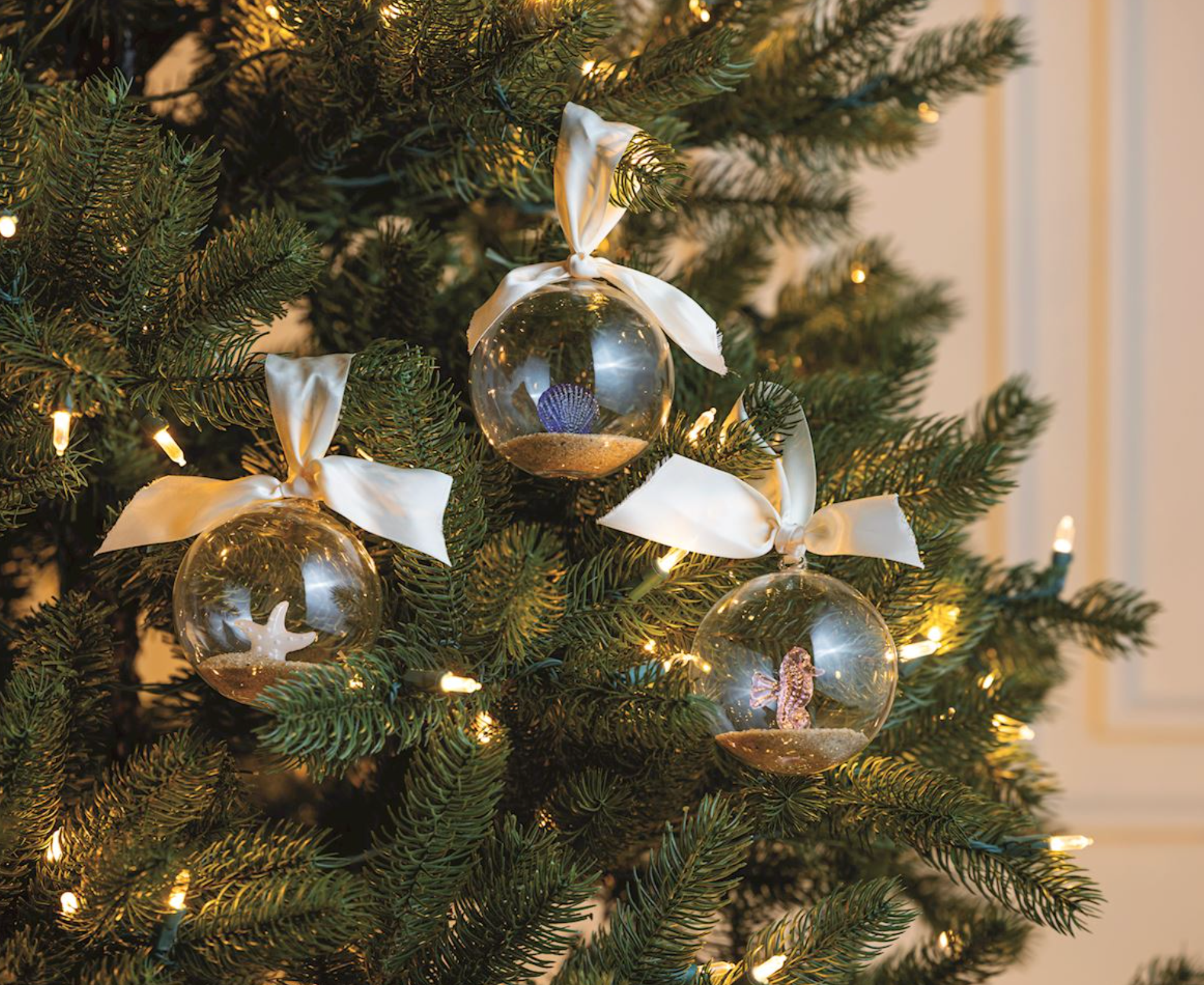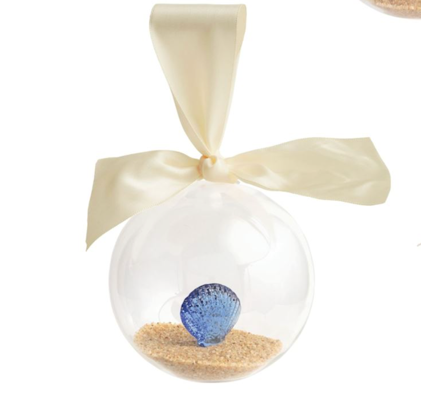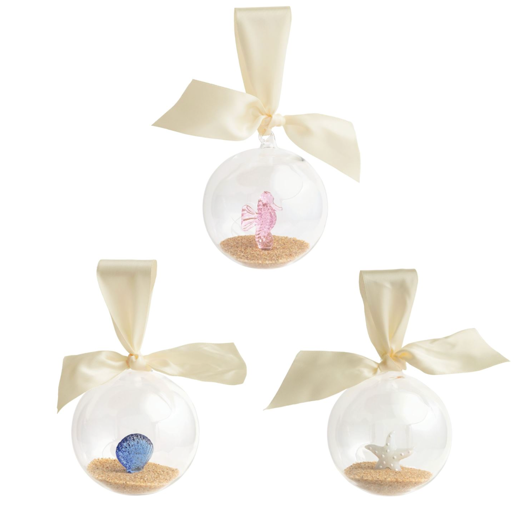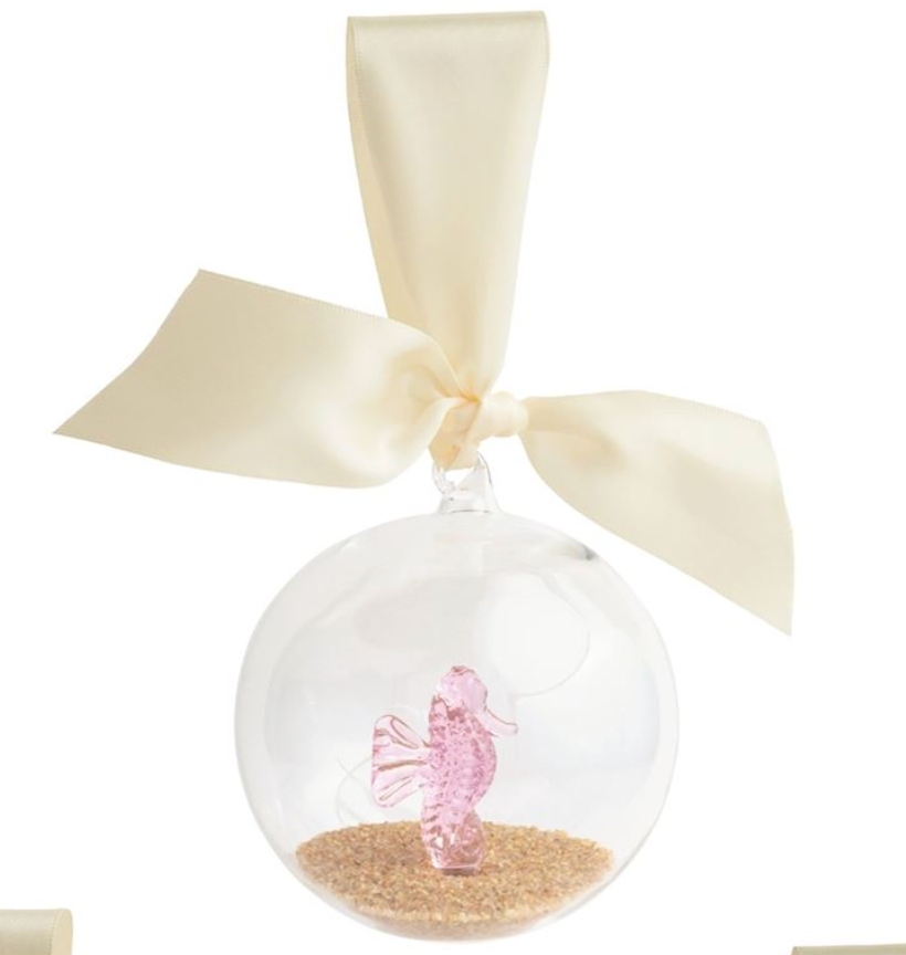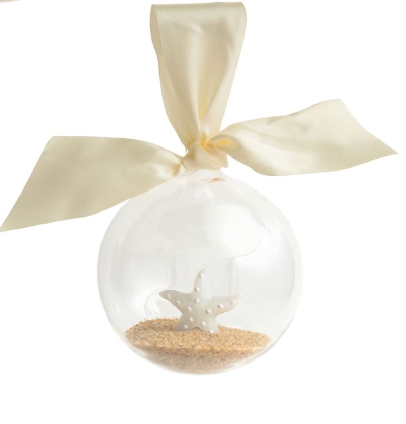 Hand blown glass ornament filled with sand features interior icon attachment and satin bow hanger.