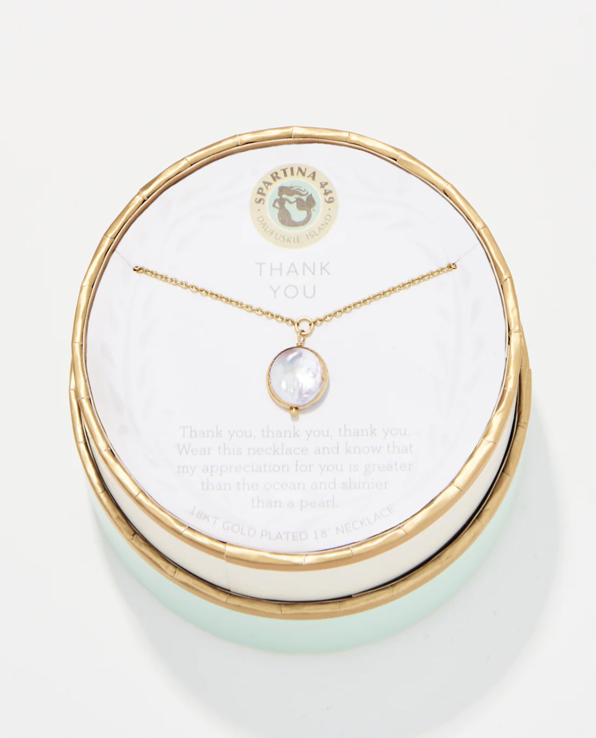 Wear this Thank You Necklace as a reminder that you are appreciated. Featuring a coin pearl charm, this special piece comes packaged inside a beautiful box with the message: "Thank you, thank you, thank you. Wear this necklace and know that my appreciation for you is greater than the ocean and shinier than a pearl."