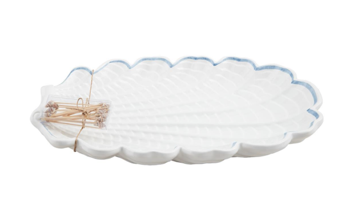 2-piece set. Milk glazed ruffle shell platter. Comes with pack of shell topped toothpicks.
