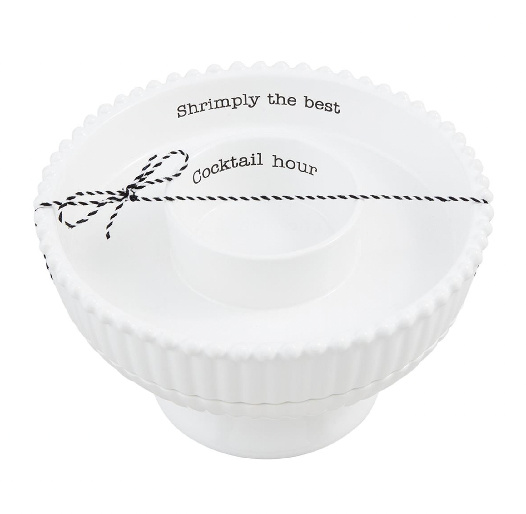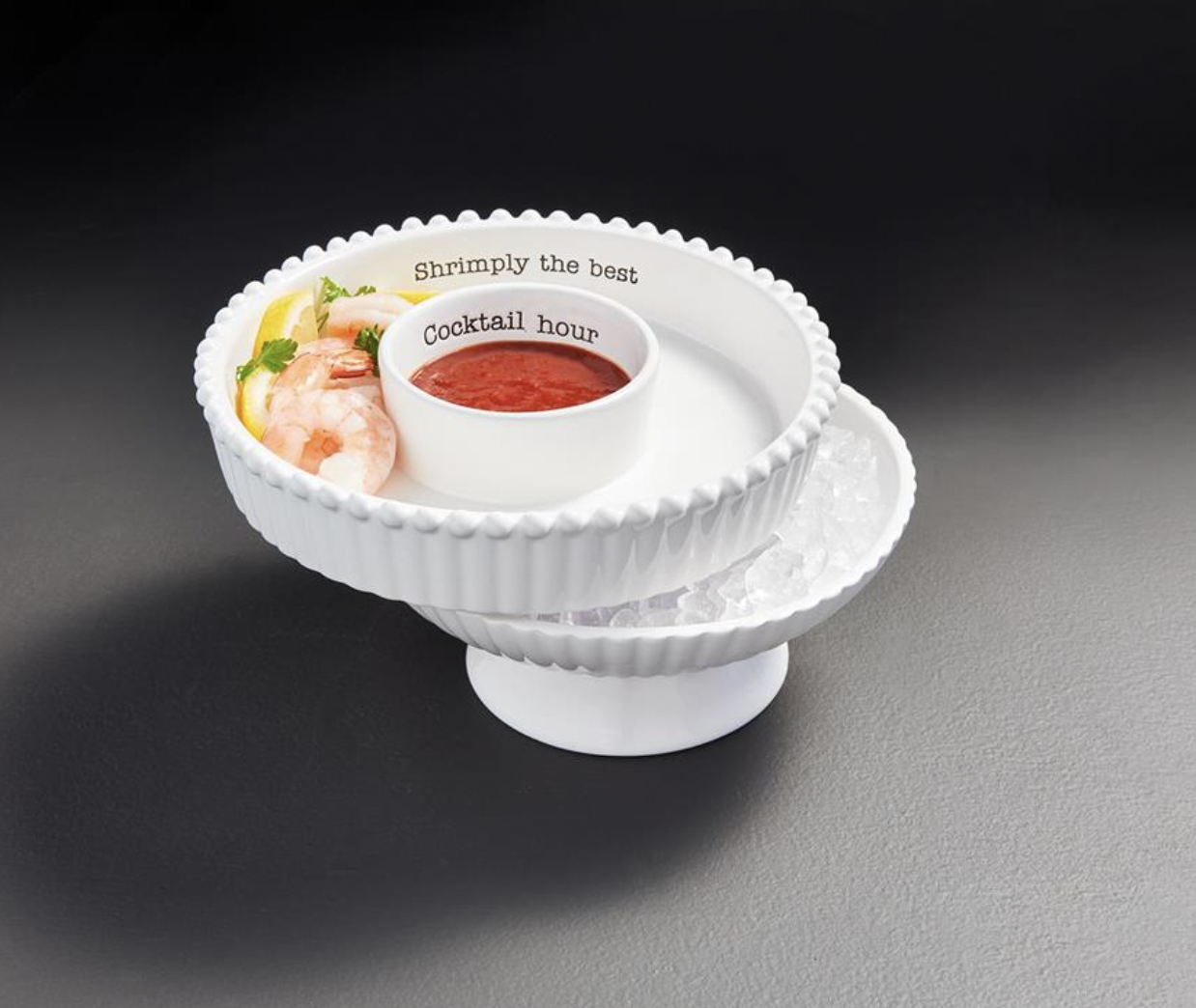 2-piece set. Textured ceramic pedestal holds ice to keep stacked shrimp and dip tray chilled.