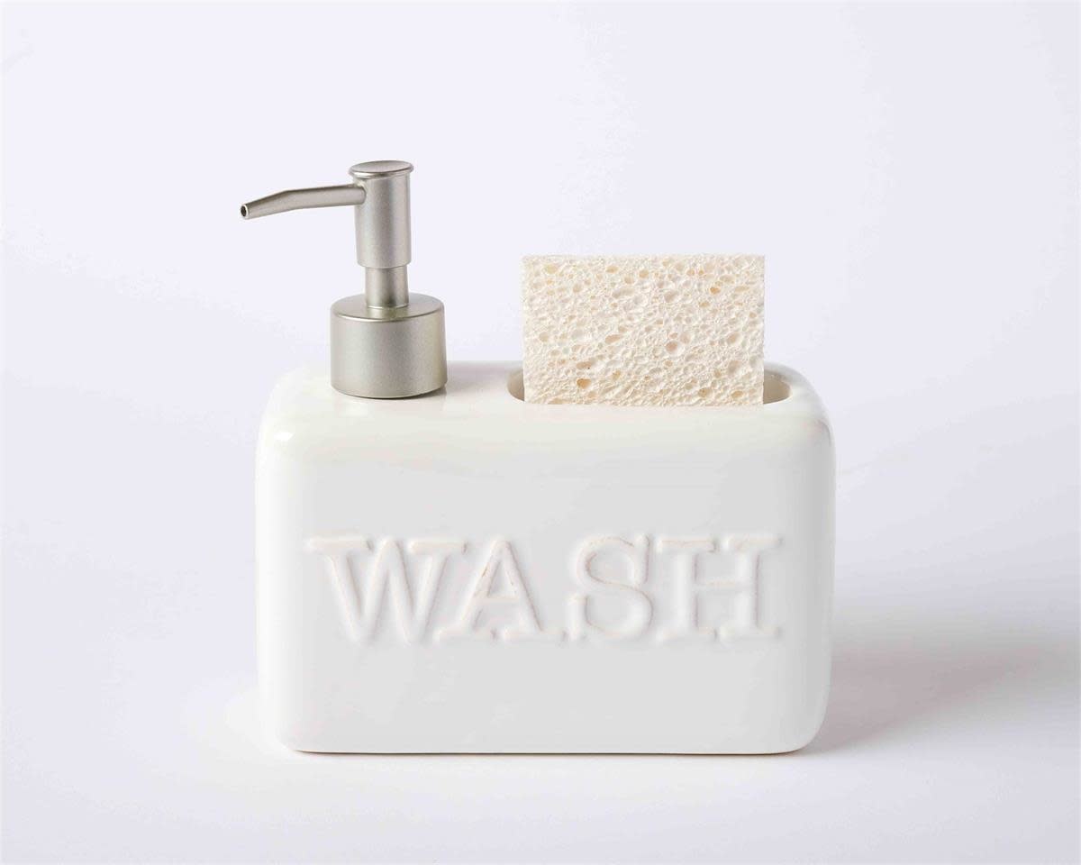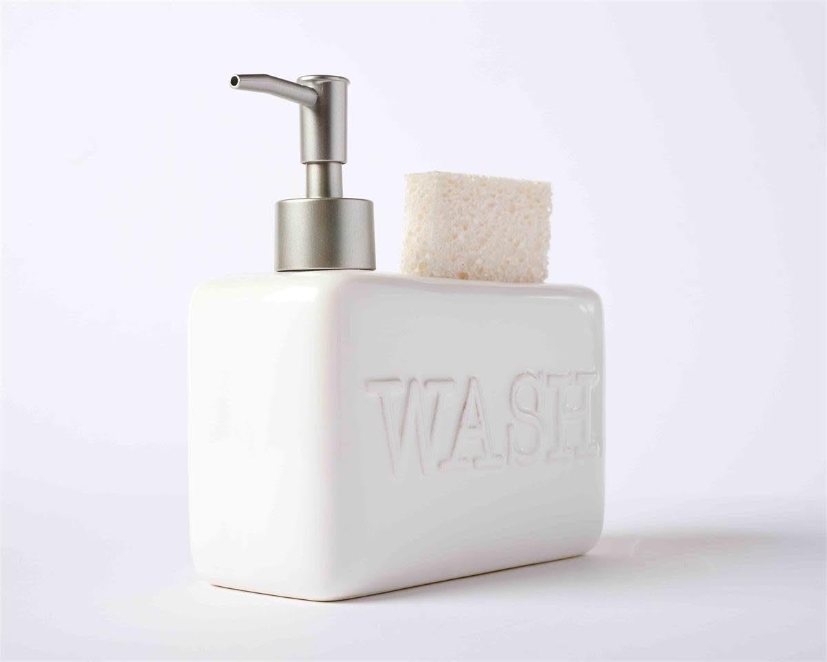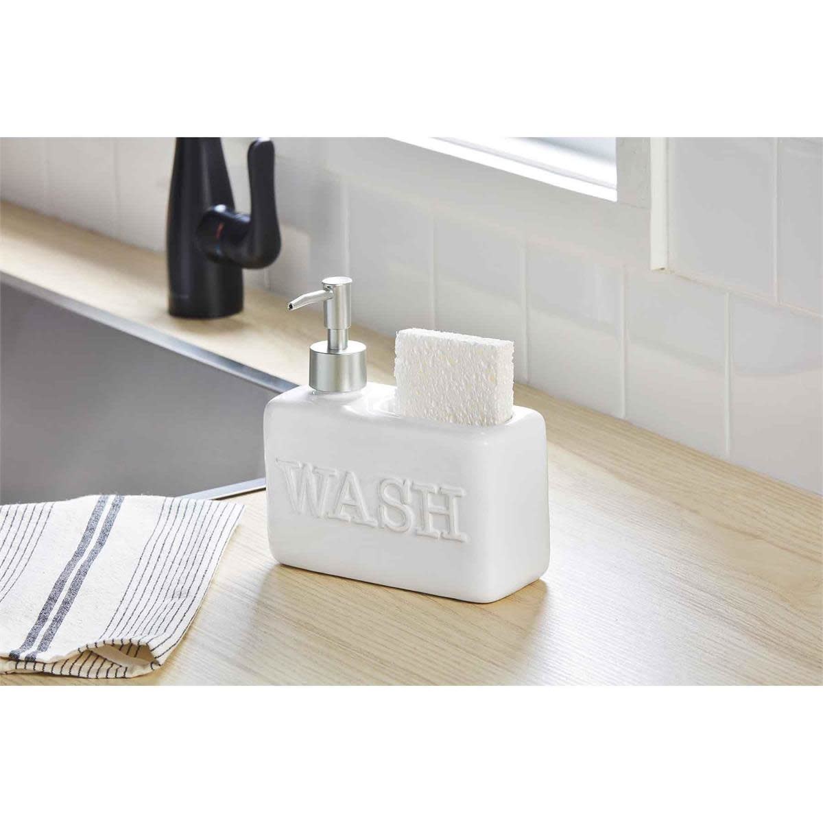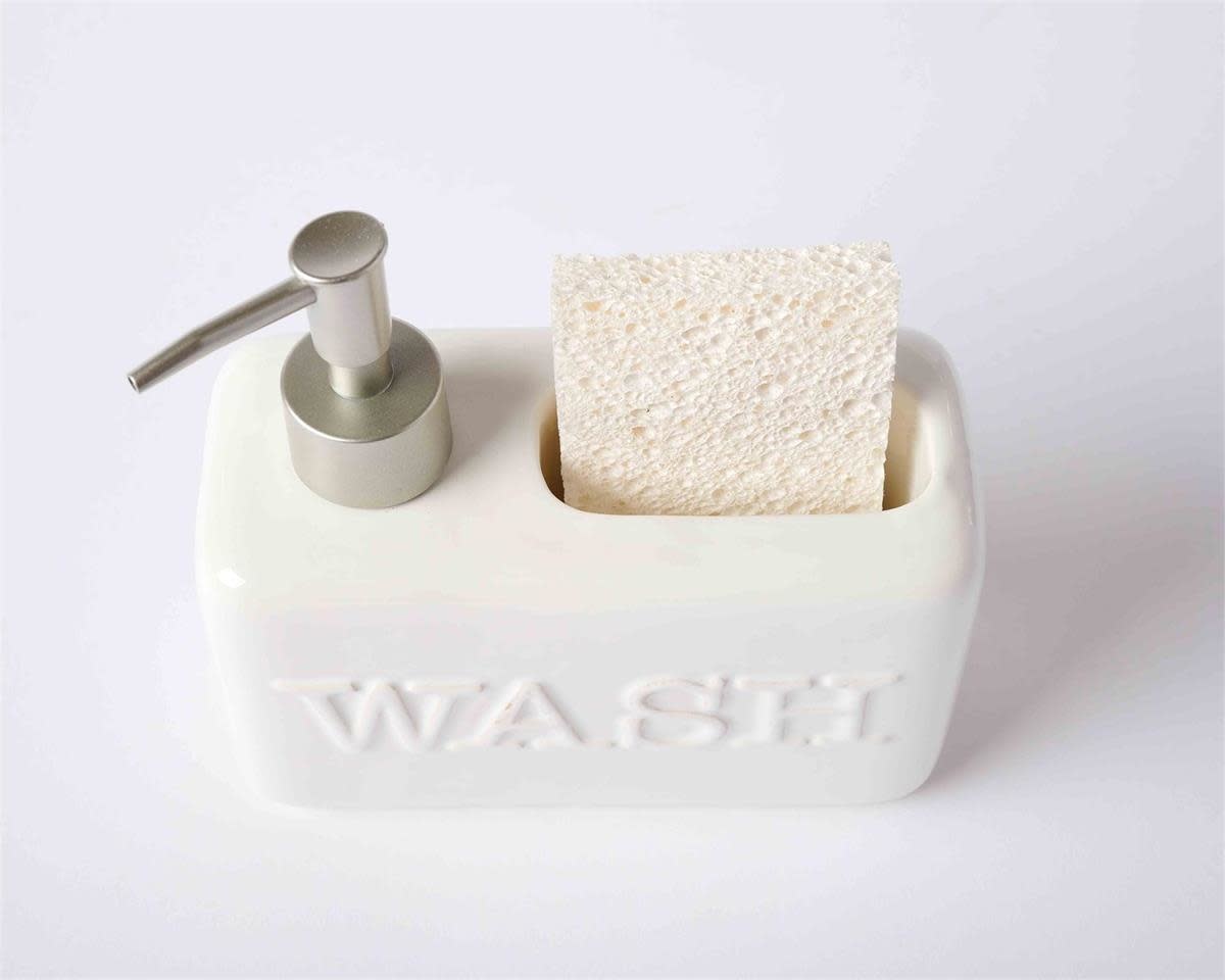 2-piece set. Ceramic soap pump with attached sponge caddy. Comes with foam sponge.