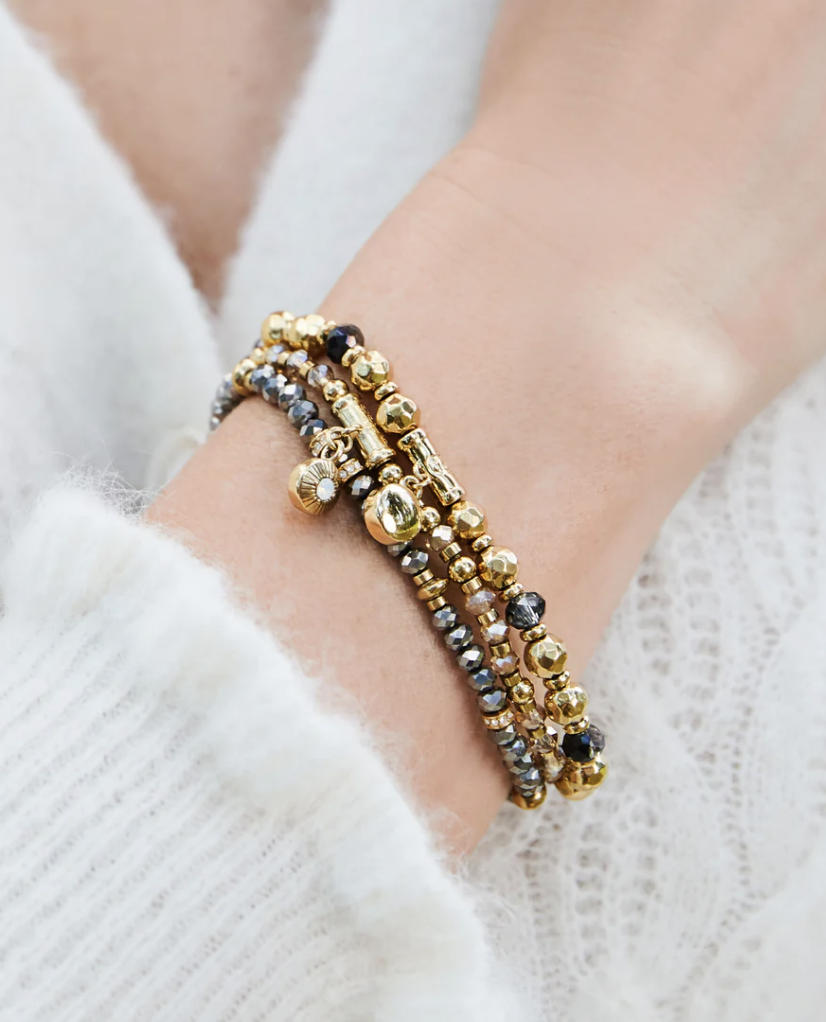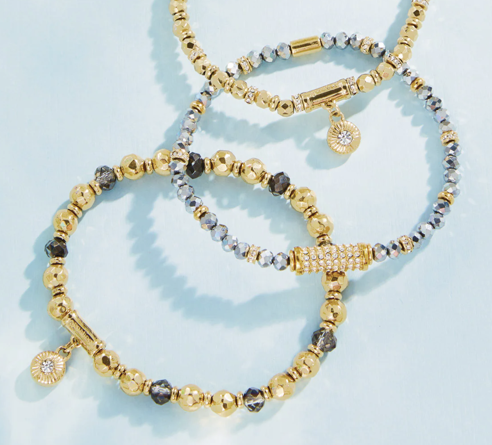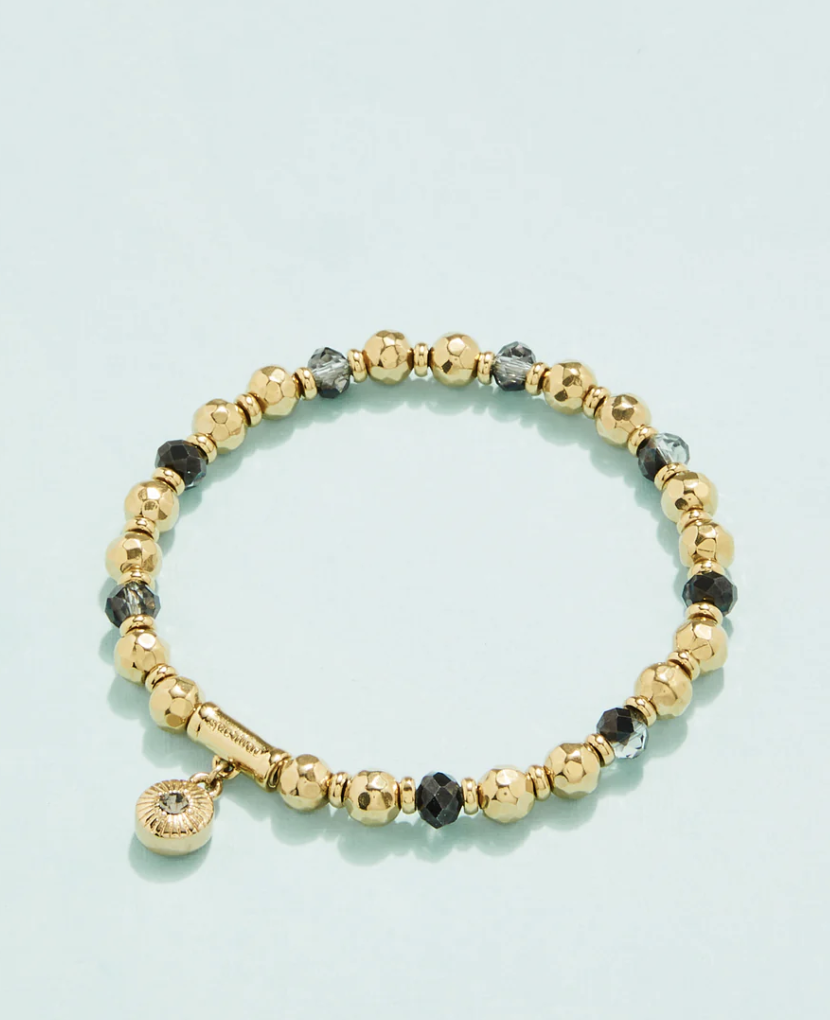 Here is a bracelet you will never have to take off! Great for stacking or mixing and matching this easy-on stretch bracelet features shiny glass and classic gold beads. Designed to shine through everyday wear, exercise, showers and a summer at the beach in tarnish free 14kt gold vacuum plating.