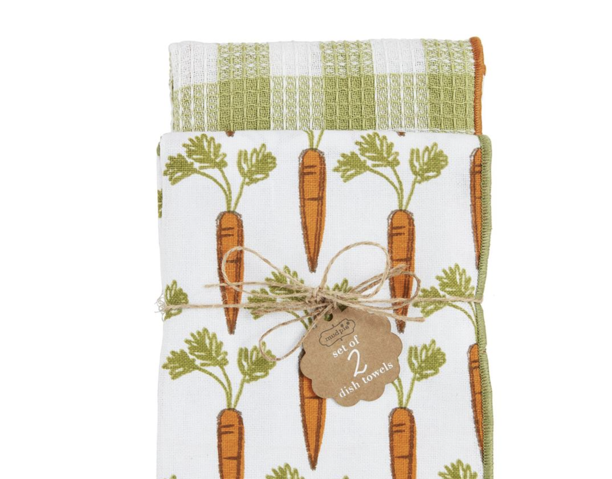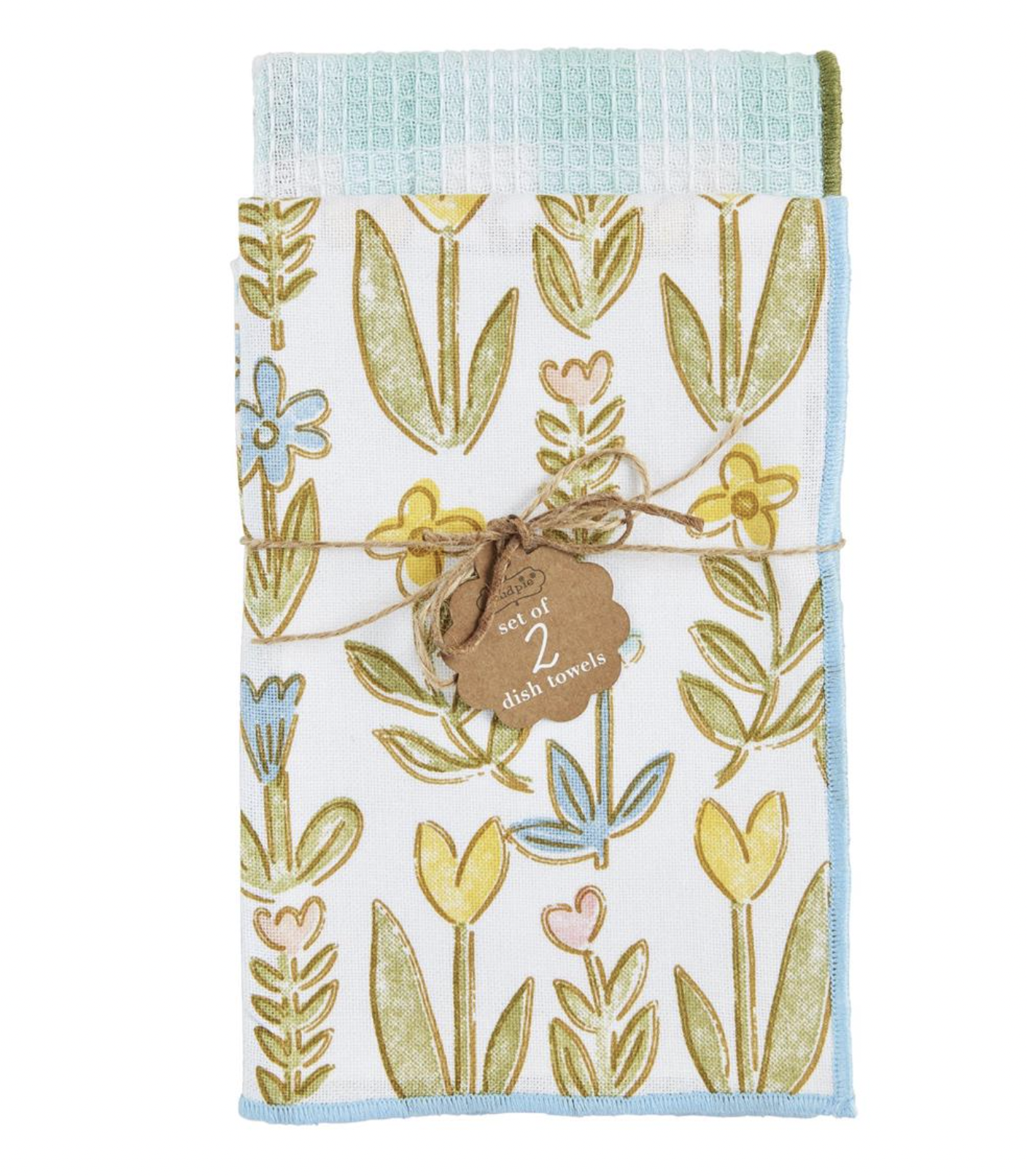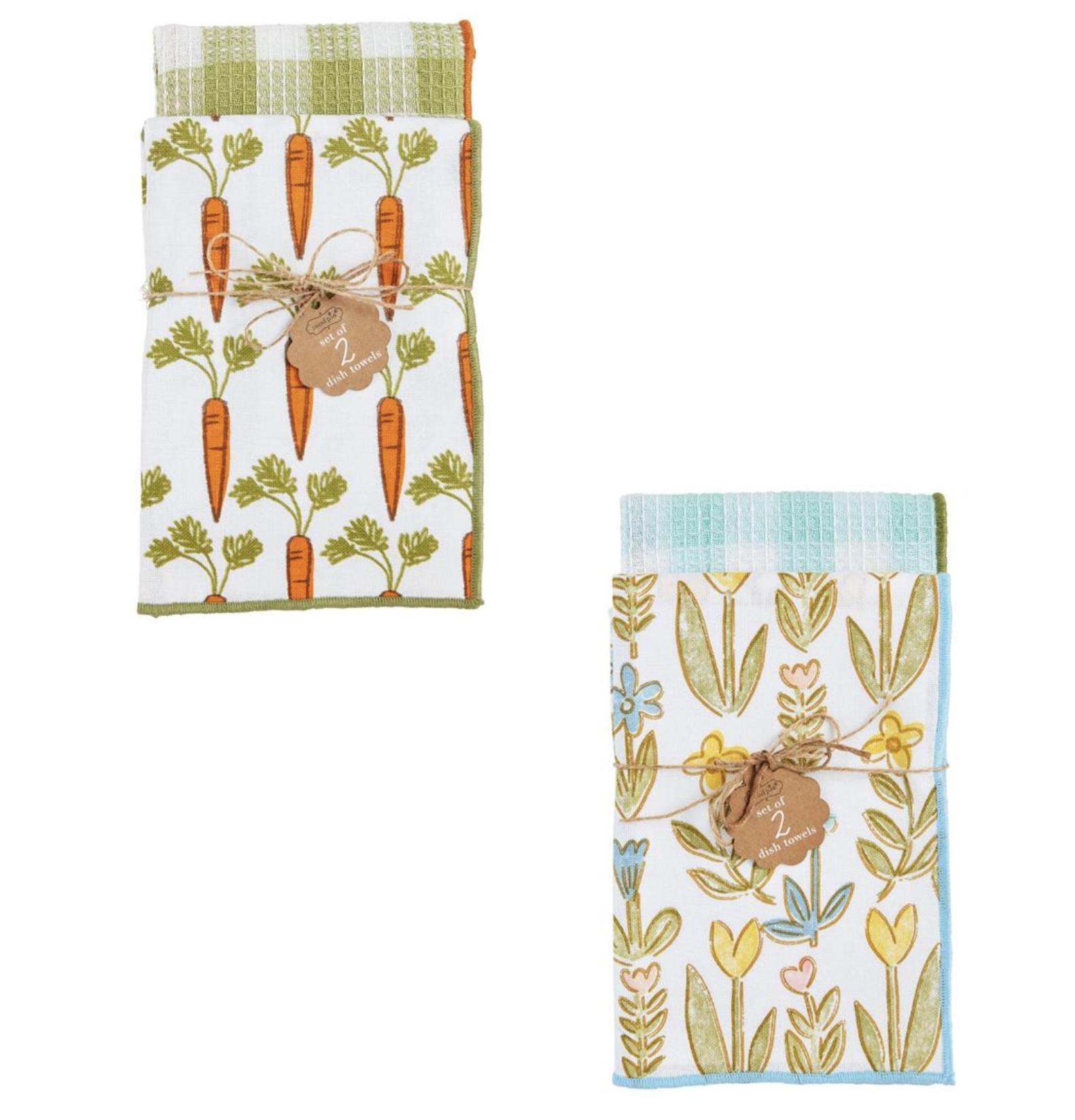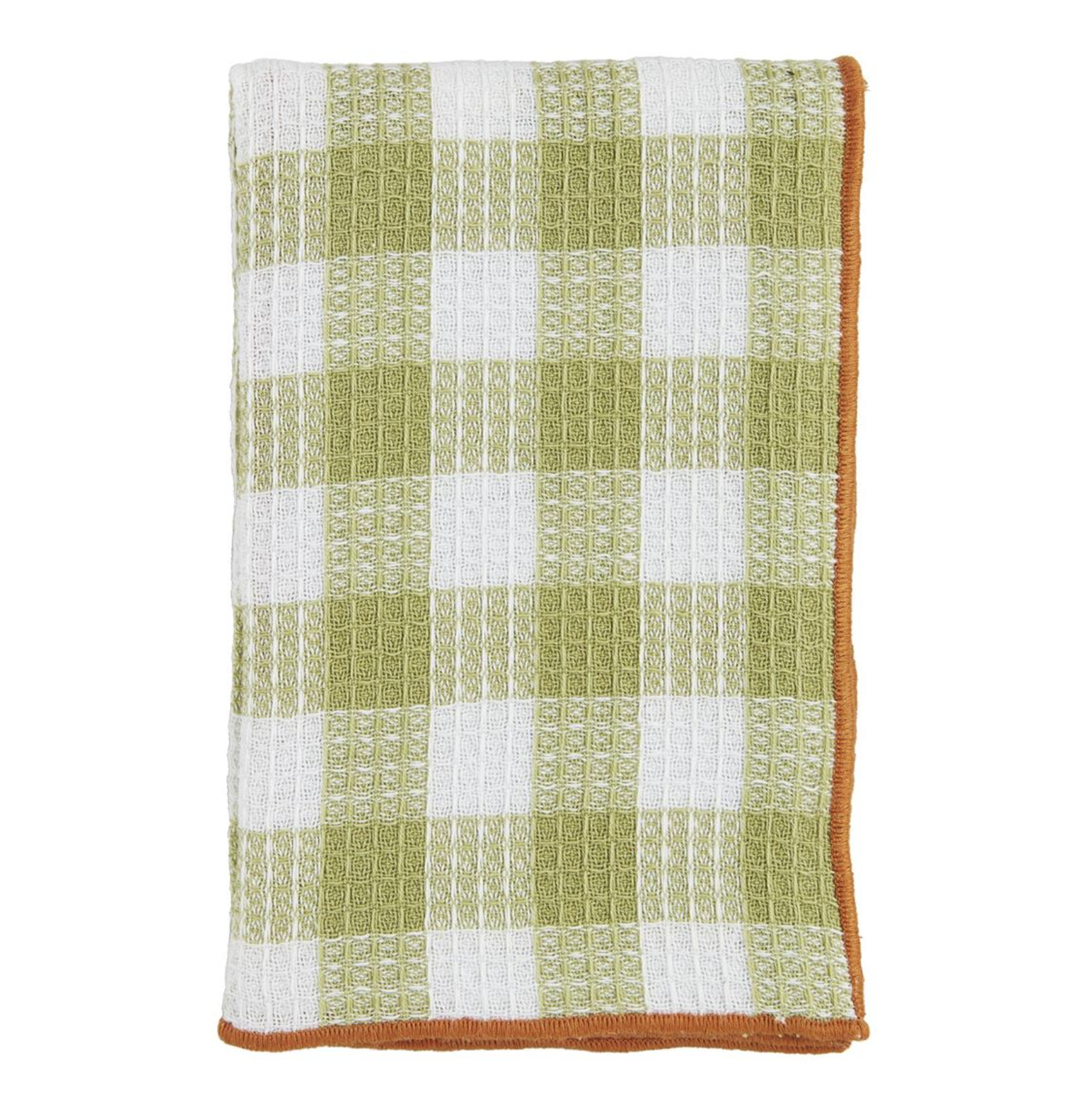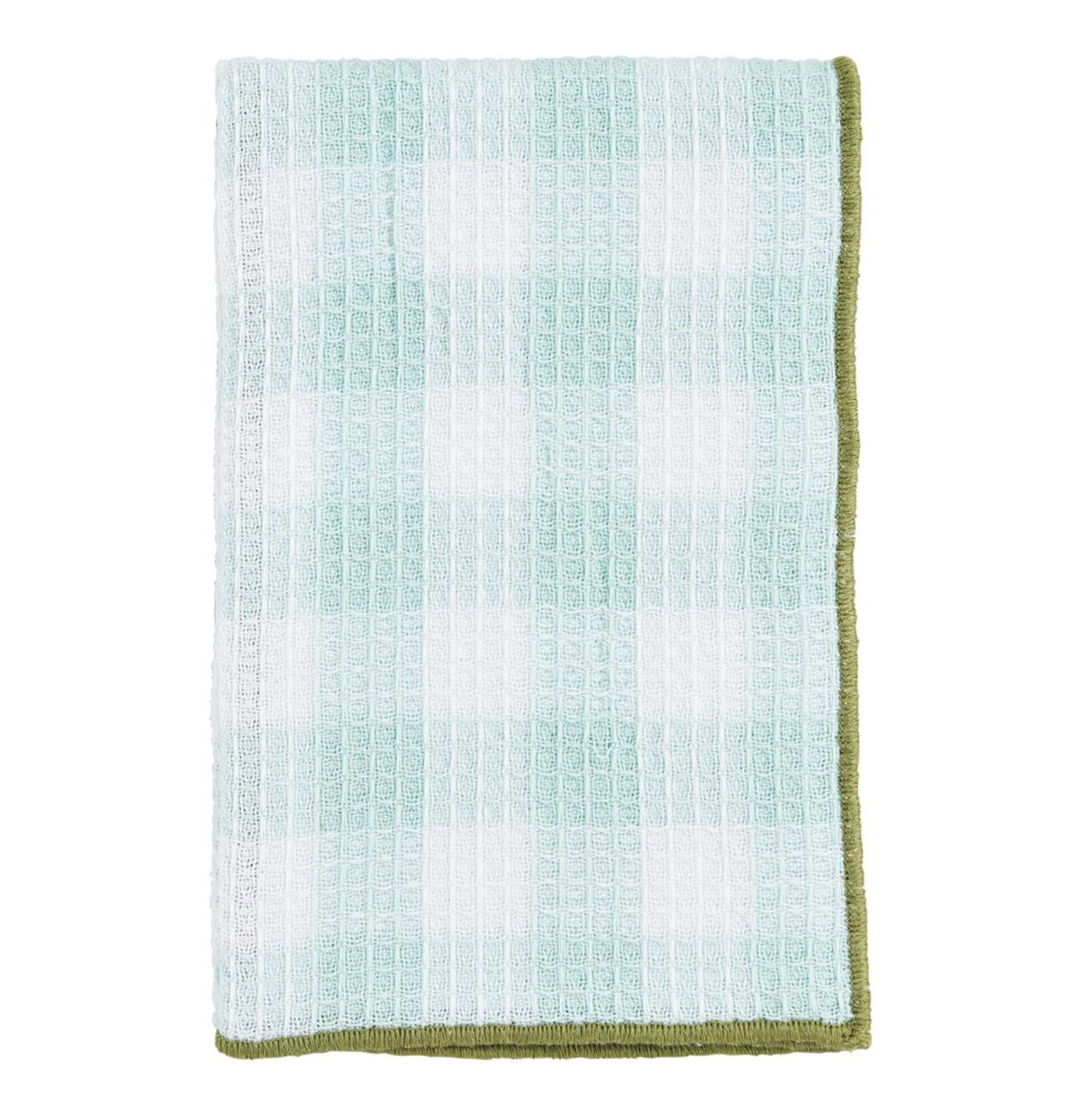Set of two cotton and waffle weave hand towels with satin stitch trim and hanging loop.