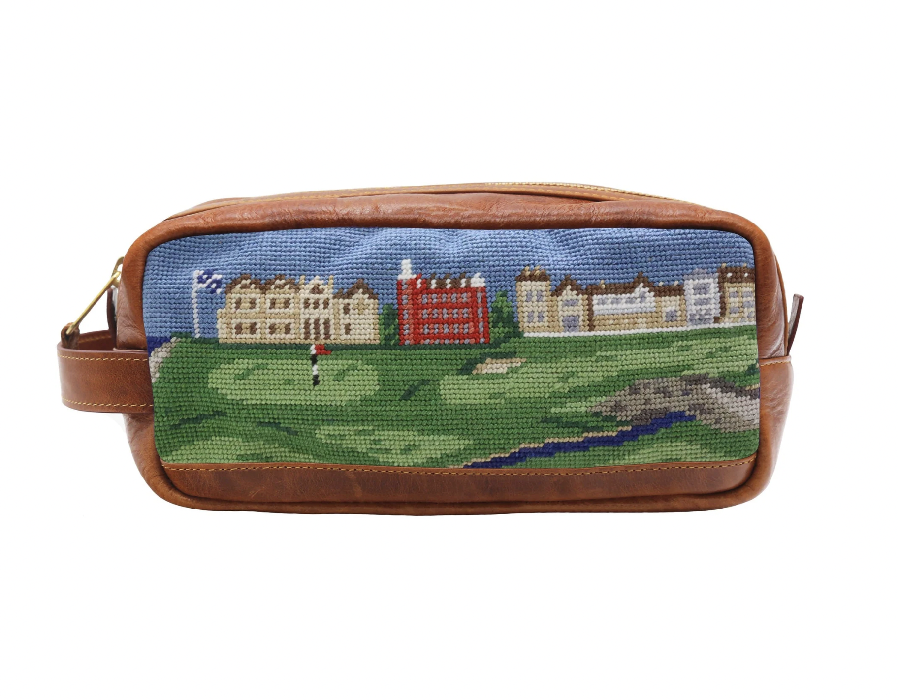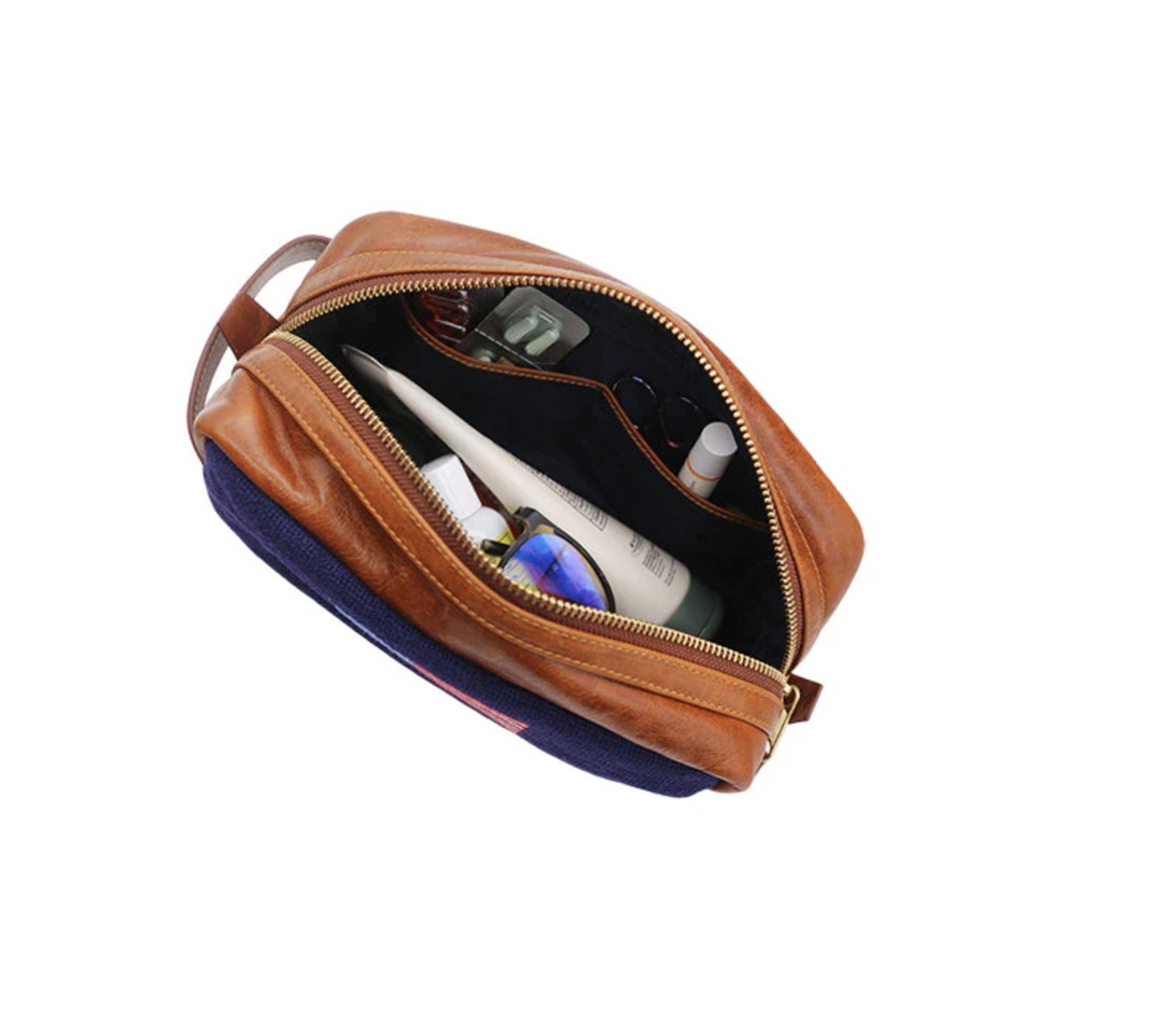 Smathers & Branson Needlepoint Toiletry Bags are made with 100% hand-stitched needlepoint, full-grain Italian leather, and lined with an easy to clean, water repellent, nylon fabric.