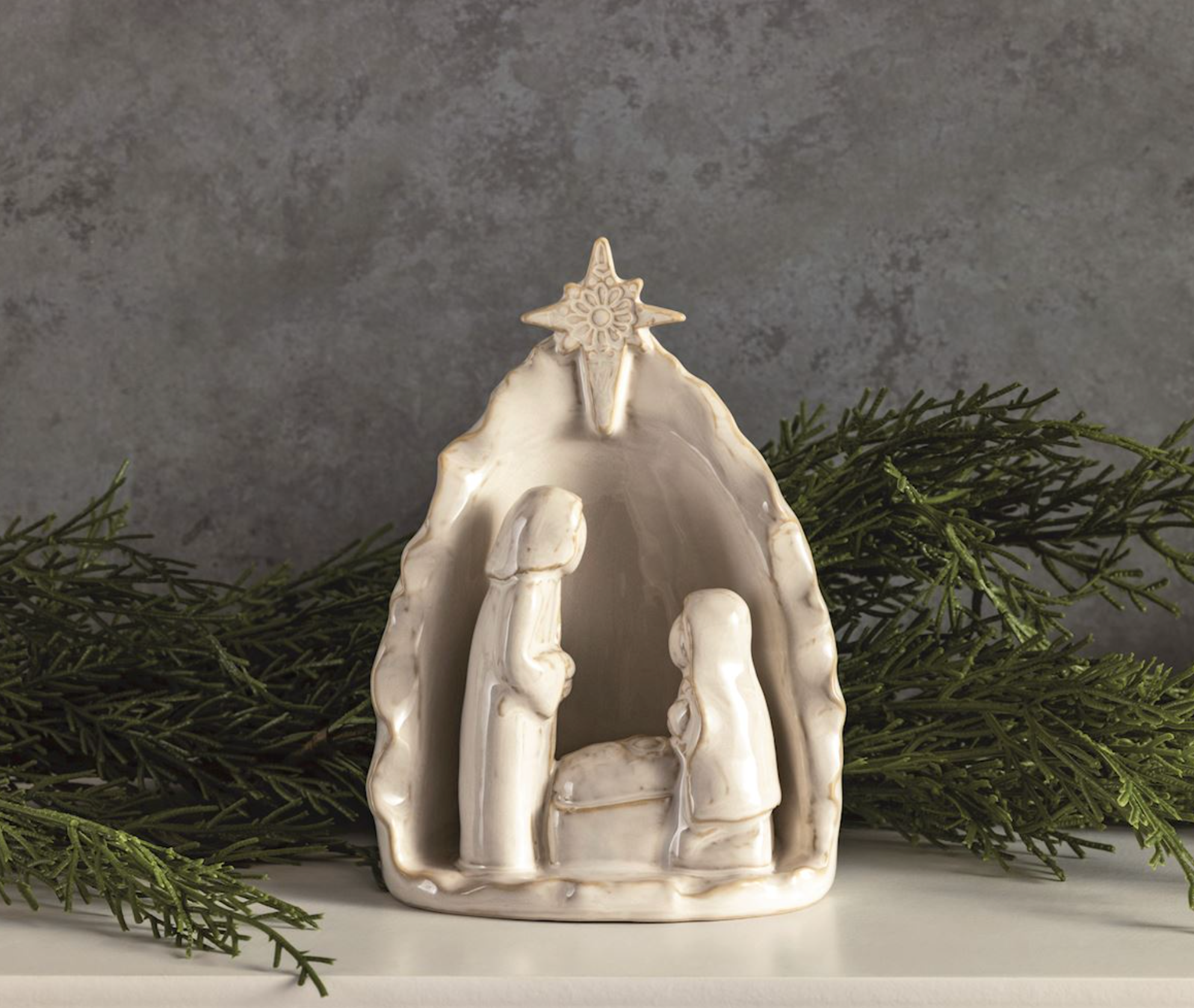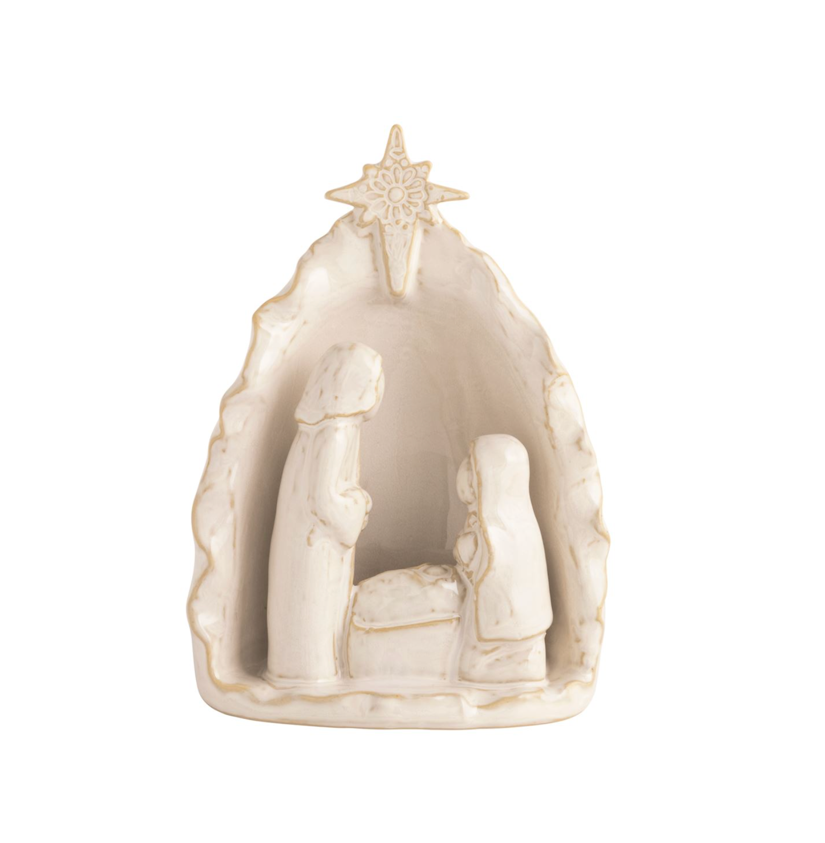 Milk glazed stoneware display features dimensional attached Nativity scene.
