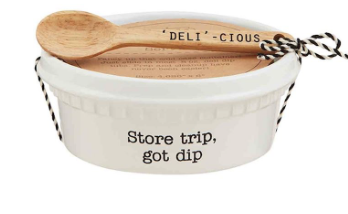 2-piece set. Ceramic container is perfectly sized to hold cold case dip containers. Comes with wooden spoon.