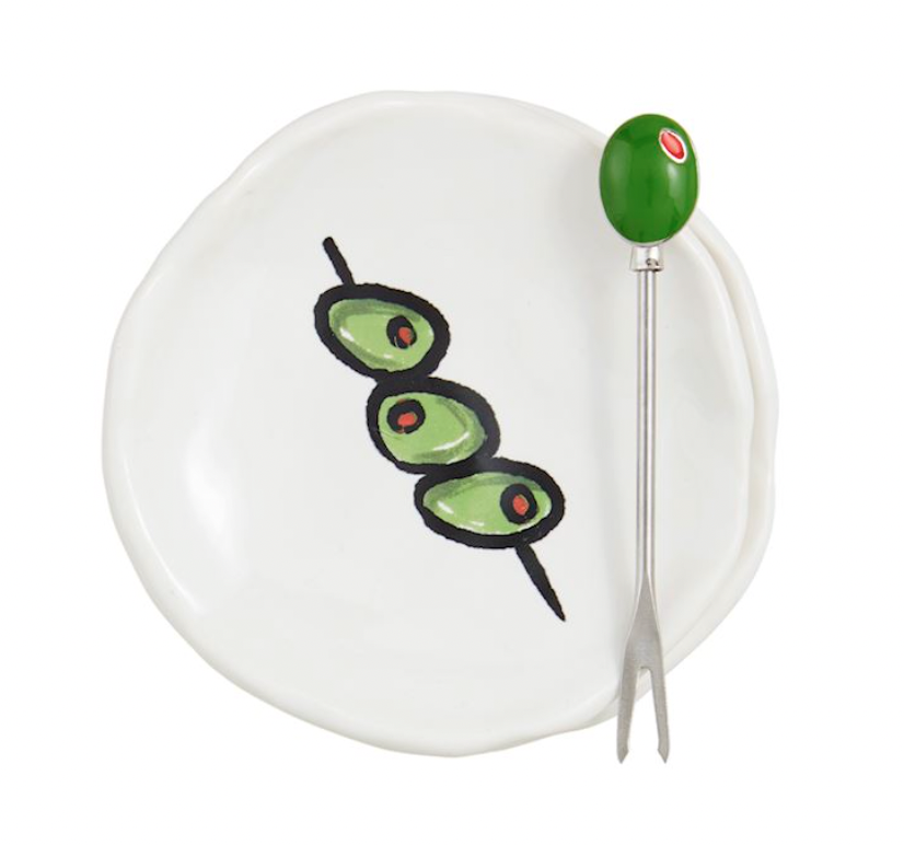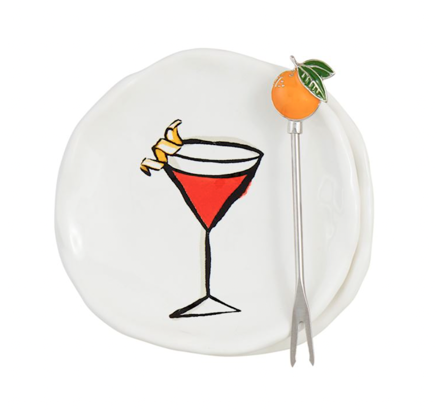 3-piece set. Two Stoneware tidbit dishes come with metal tapas fork with enamel figural topper.