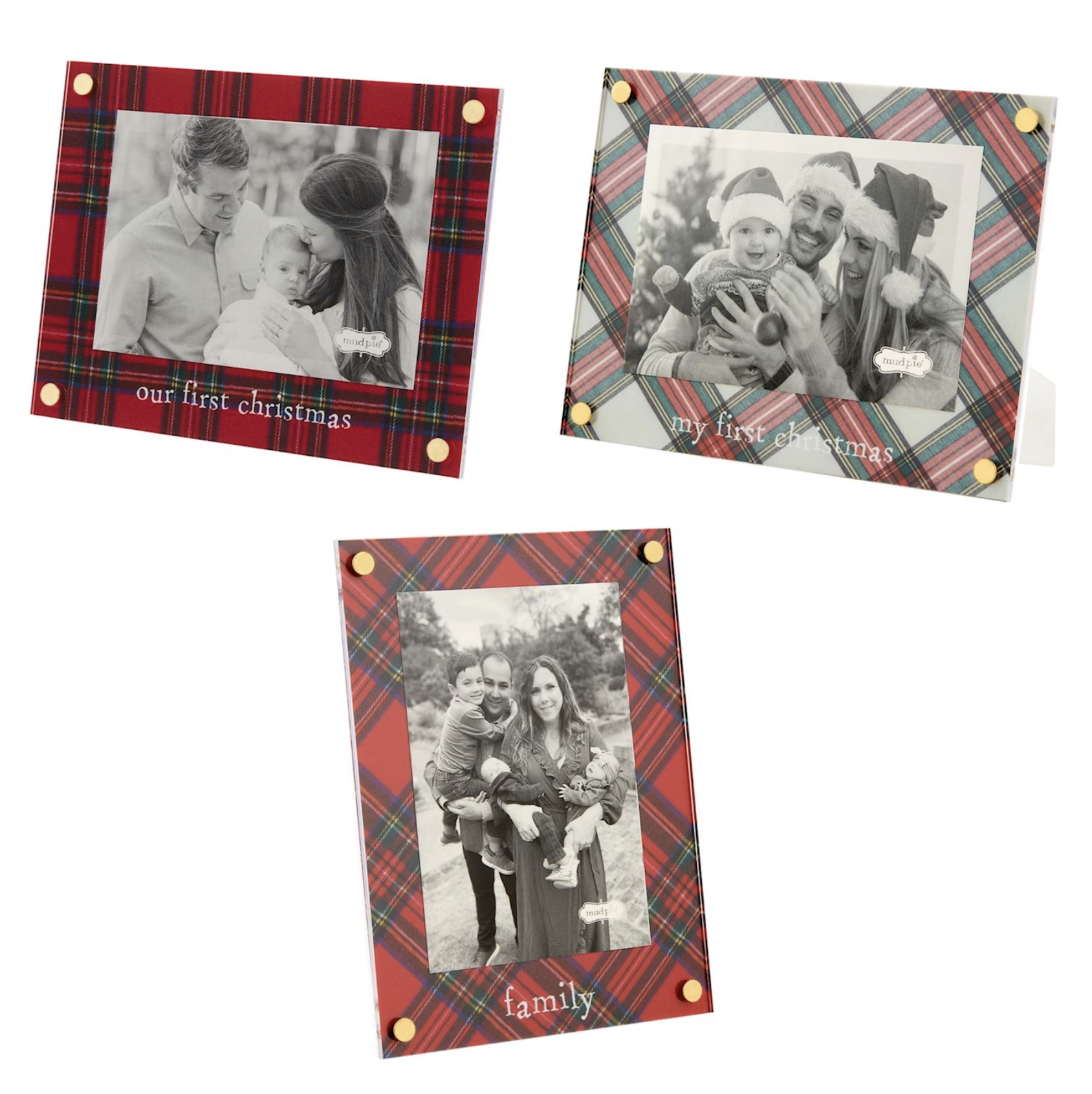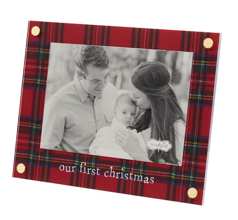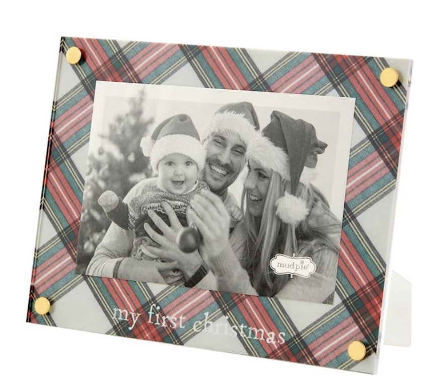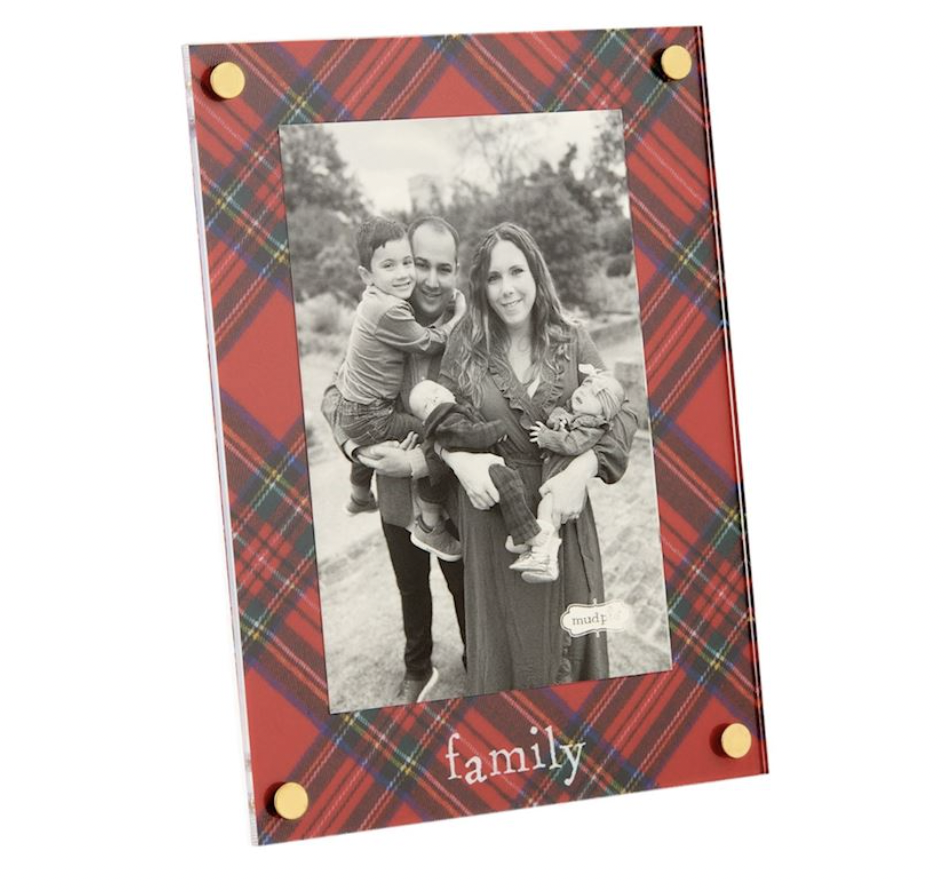Acrylic 4" x 6" frame features tartan matting and gold corner rivets. Easel back.