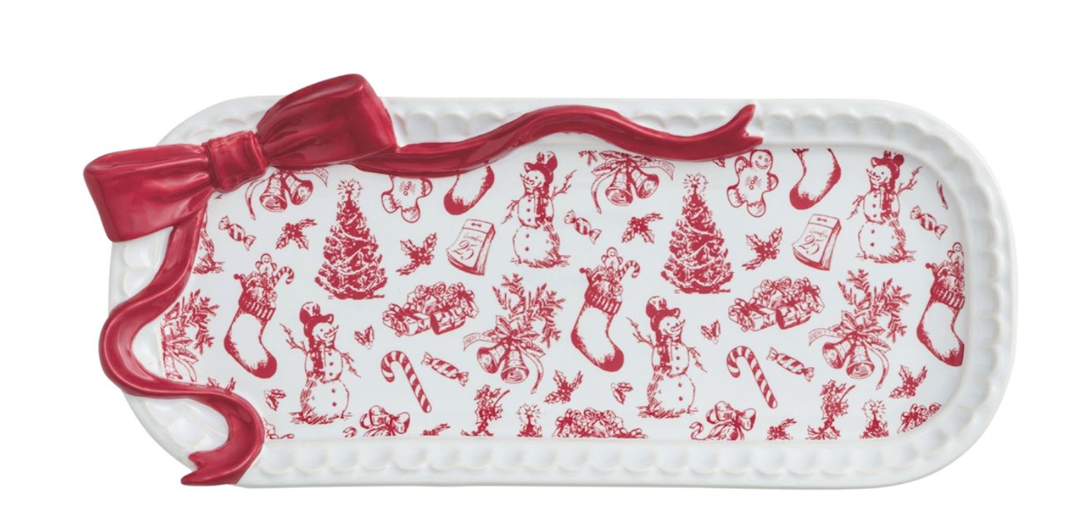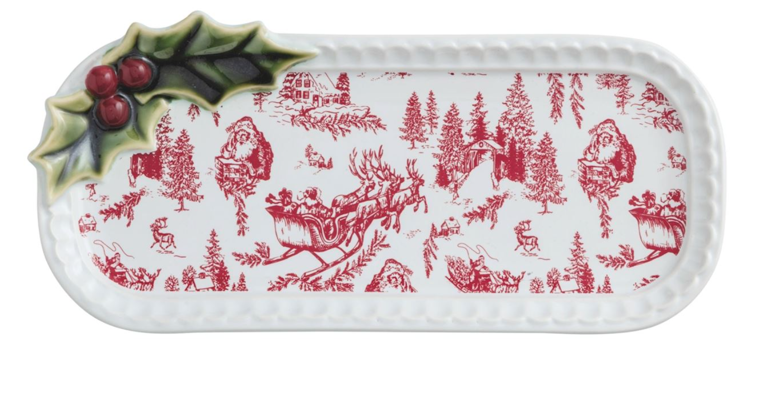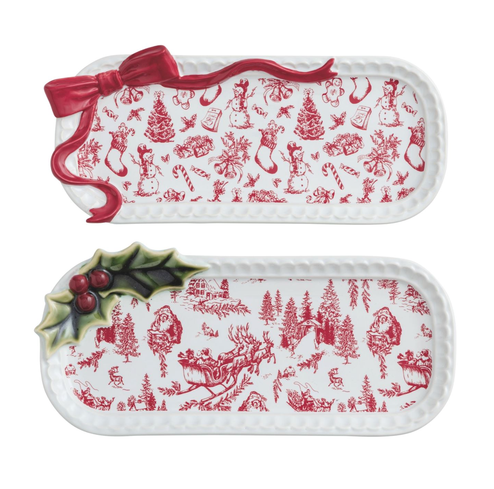 Fluted stoneware everything plate features toile surface and hand-painted stoneware holly cluster or bow attachment.