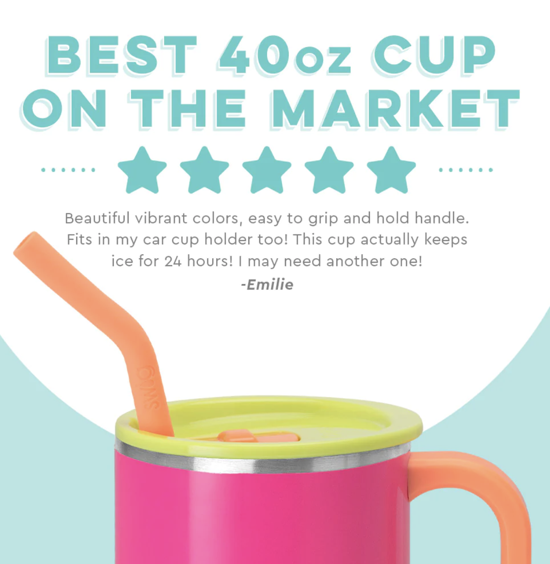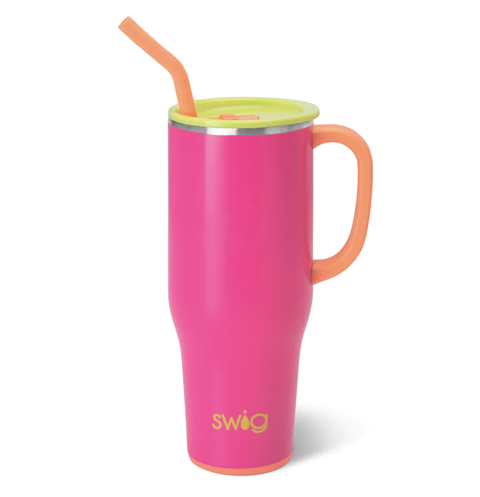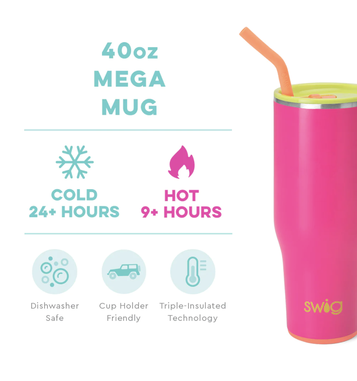 Hydrating has never been easier with the 40oz Mega Mug! The cup holder friendly frame, comfort-grip handle and flexi-tip straw with a standard plastic straw base come together to create your new favorite Swig!