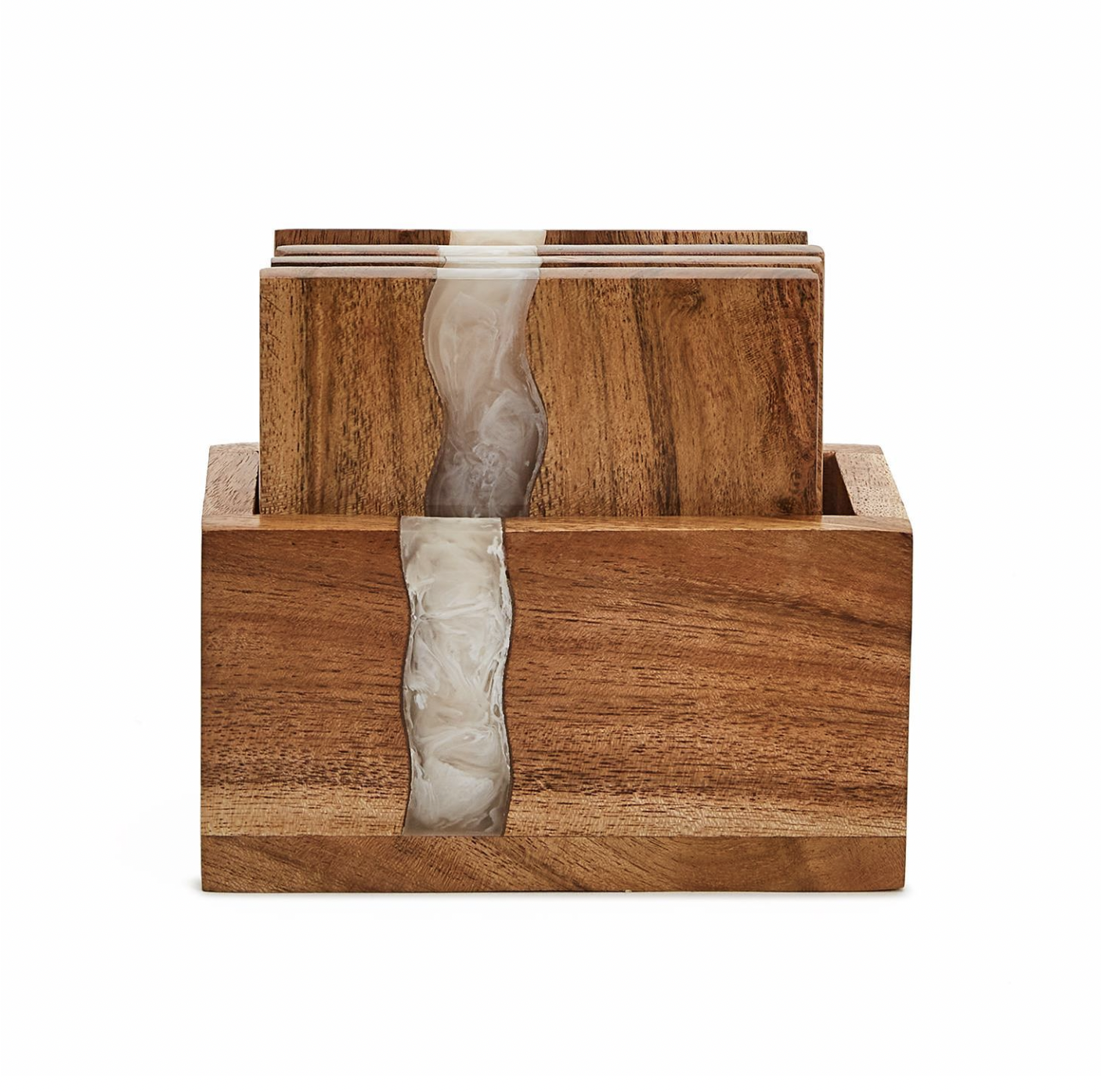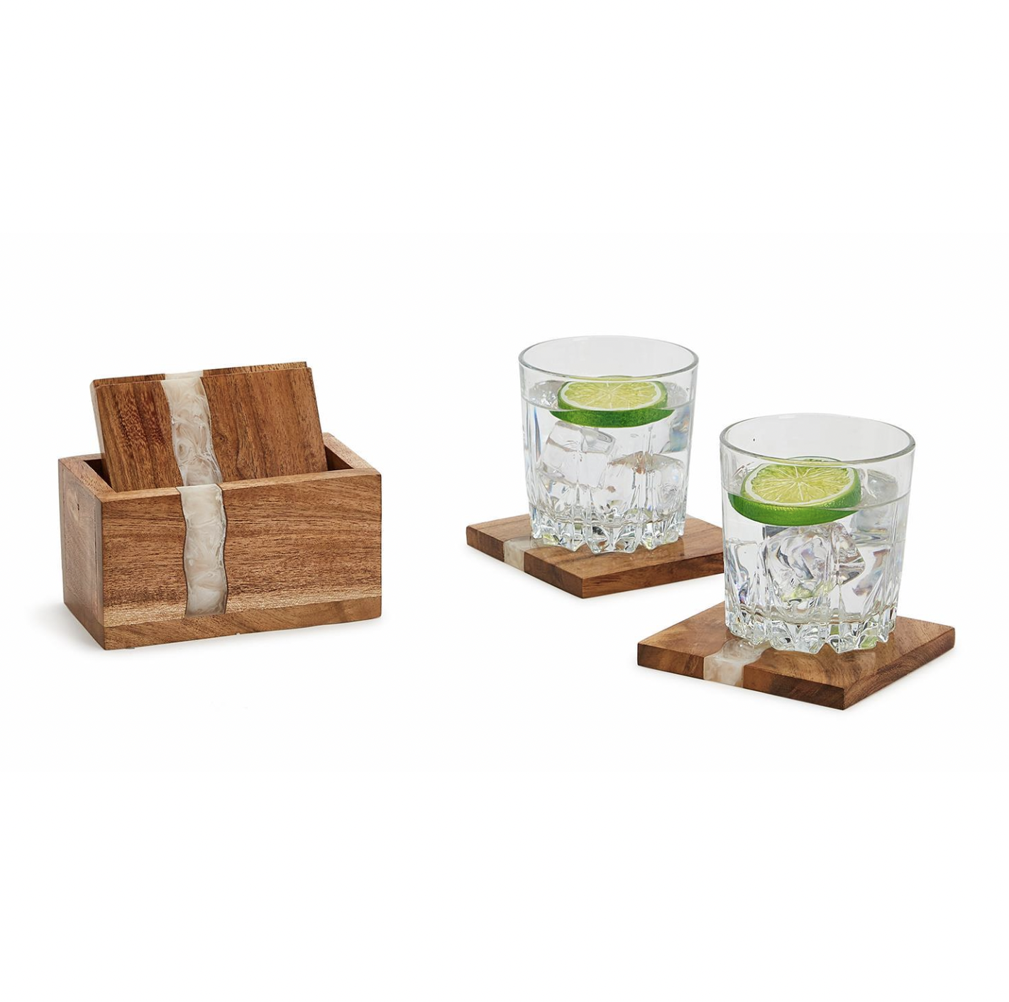 Verglas Set of 4 Coasters with Holder (minor imperfections and variations are natural characteristic of material and hand-crafted origin) - Acacia Wood/Resin