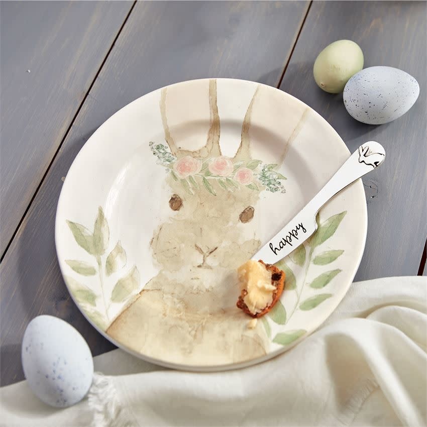 2-piece set. Ceramic cheese plate features watercolor bunny artwork surface and arrives gift boxed with stamped pewter bunny spreader.
