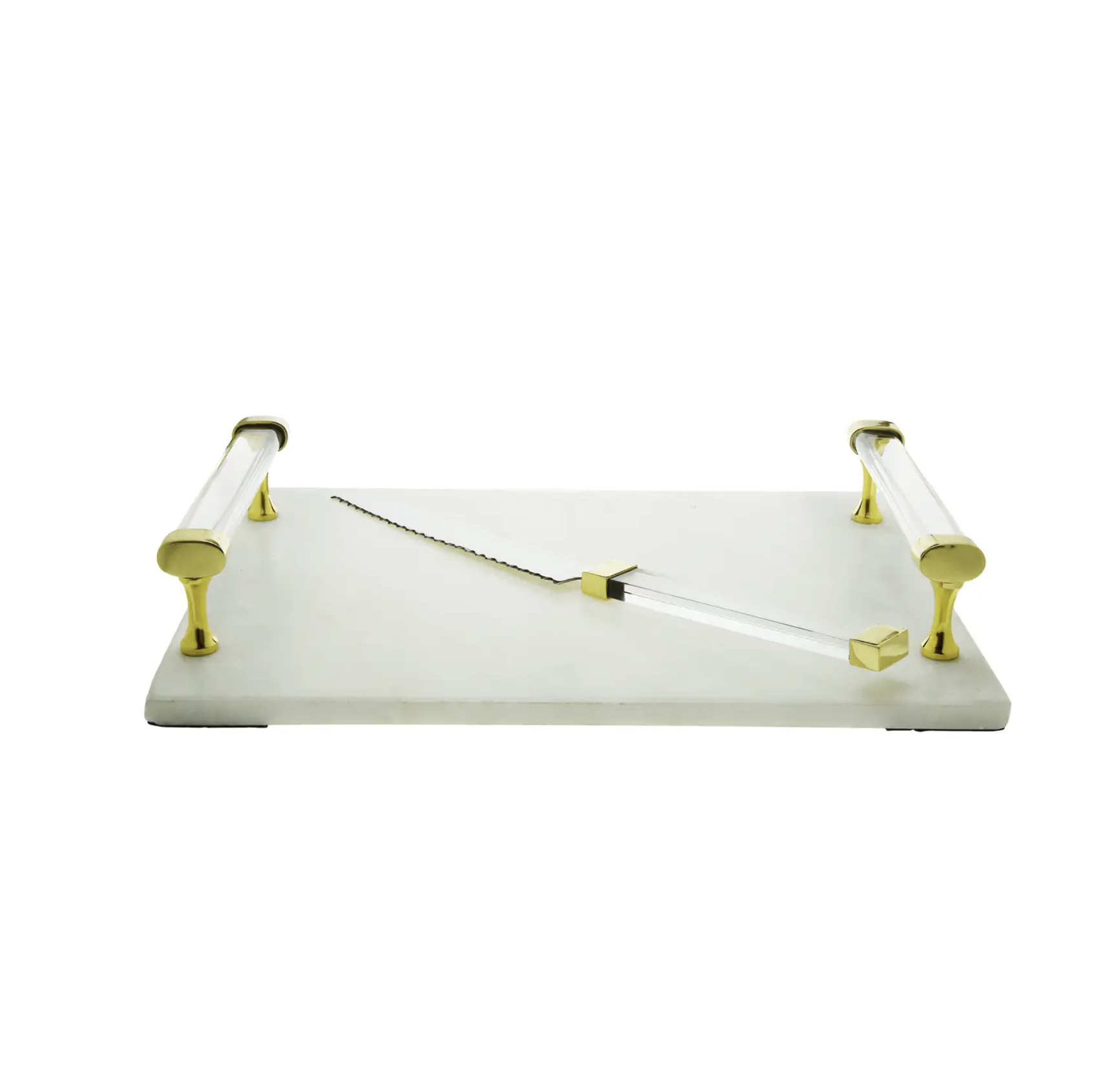 WHITE MARBLE TRAY WITH ACRYLIC HANDLES AND KNIFE