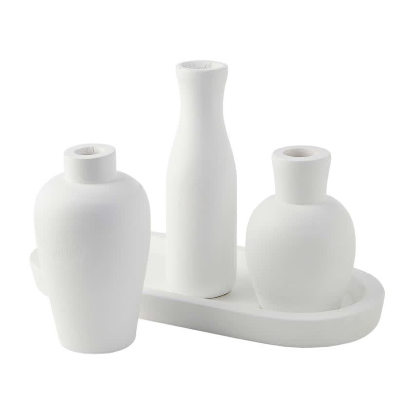4-piece set. Hand-painted paulownia wood tray holds three coordinating vases.